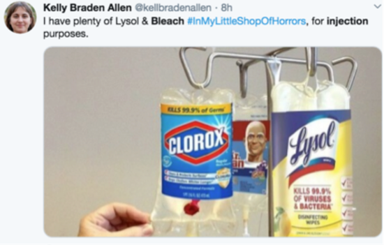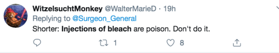 也有网友温馨提醒:“注射漂白剂有毒,不要这么做。”