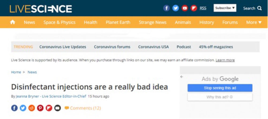 美国克利夫兰大学医院的医学毒理学家瑞恩·马里诺表示,“总统提出医学建议不止一次,但这次真是出乎意料,已超出了常识范畴。”