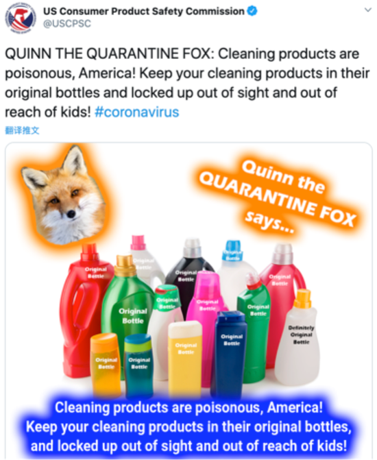 美国消费者产品安全委员会在推特上提醒:“清洁产品是有毒的,将清洁产品保存在瓶中,并放在儿童看不见和接触不到的地方!”