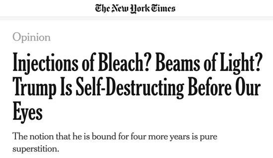 《纽约时报》24日发表题为《注射漂白剂,照射强光有助抗疫?特朗普在自毁人设》的报道。