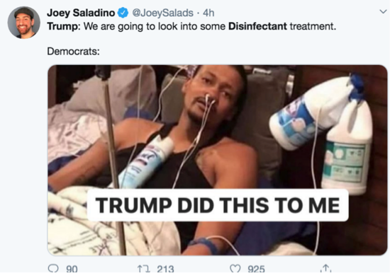 但网民显然对特朗普事后的否认并不认账,段子手们贴出了各式各样恶搞消毒剂的图片。