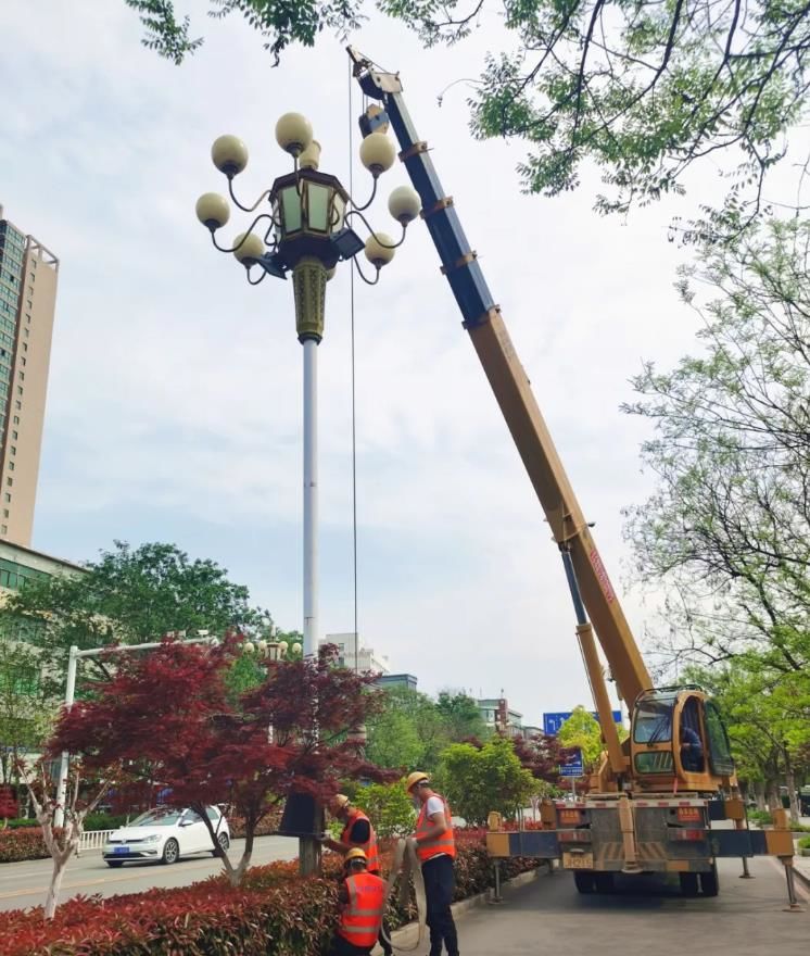 除了文学路,永康路、永盛路、永昌路的路灯升级改造也是今年重点城建工程之一。王洪生告诉记者:“政府周边的三条道路路灯总共有73组,灯具灯杆都同样锈蚀严重,我们也将其更换为600瓦的四火灯具,同时对政府周边的喷雾系统进行更换维修。”