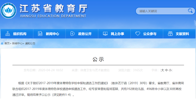 日前,省教育厅发布公示,根据《关于做好2017-2019年度体育特色学校申报和遴选工作的通知》(教体艺厅函〔2019〕30号)要求,省教育厅、省体育局联合组织2017-2019年度体育特色学校遴选申报遴选工作,经专家审查和现场答辩,共有192所幼儿园、496所中小学以及30所高校通过评审。