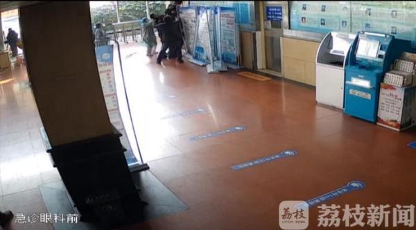 急诊大厅监控画面显示,张开华在发现二楼有人即将坠落时,赶忙跑上前去伸出了双手准备托住。事发瞬间,周围群众见状也赶忙上前帮忙。最终男子坠落时被大家合力接住,但是热心老人张开华的颈部受了伤。