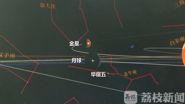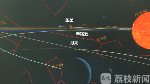 中科院紫金山天文台工程师胡方浩介绍,"双星"有一颗是金星,另外一颗是恒星毕宿五,毕宿五在金牛座,金星在它自己的轨道上绕太阳运动,月亮在它自己的轨道上绕地球运动,凑巧出现了今天这种情况,从地球看,金星和毕宿五是环抱着月球,而且因为今天是农历初四,所以将看到一弯新月在天空中。