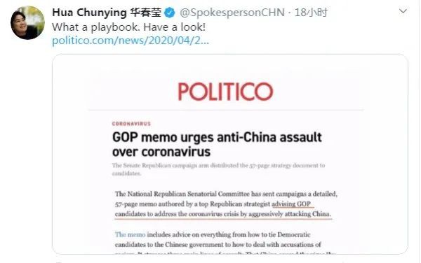 美国《政治报》网站日前曝光了美国共和党参议员全国委员会向各竞选团队发送的一份备忘录,此备忘录建议共和党参议员竞选人在回应美国新冠疫情问题时积极攻击中国。