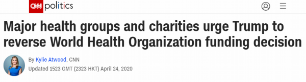 美国总统特朗普4月14日宣布停止对世界卫生组织(WHO)进行资助,原因是世卫组织在疫情期间严重管理不当,掩盖真实情况。该指控遭到多方批驳。