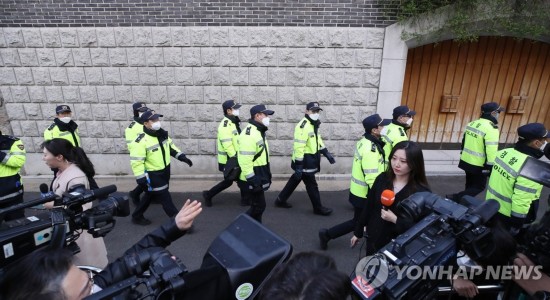 27日早上,全斗焕住宅外,大批警力正在维持秩序。(韩联社)