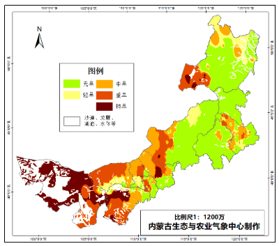 经过前期一轮大范围降水天气过后,东部地区旱情得到明显缓解,但中西部地区旱情持续,截止到4月24日,全区大部干旱以重旱为主,中旱以上干旱主要出现在阿拉善盟、巴彦淖尔市大部、鄂尔多斯市大部、包头市北部、呼和浩特市西北部、乌兰察布市北部、锡林郭勒盟西北部、通辽市北部、呼伦贝尔市西部地区。当前干旱面积54.58万平方公里,占总面积的55.4%。其中,特旱面积12.94万平方公里,重旱面积17.41万平方公里,中旱面积14.66万平方公里,轻旱面积9.57万平方公里,分别占全区的13.1%、17.7%、14.9%、9.7%。当前干旱发生面积牧区约6成,以重旱为主;农区接近4成,以中旱为主;林区超4成,以轻旱为主。其中重旱以上旗县主要出现在阿拉善左旗、阿拉善右旗、额济纳旗、乌拉特后旗、新巴尔虎右旗、鄂托克旗、乌拉特中旗、苏尼特右旗、苏尼特左旗和新巴尔虎左旗等。