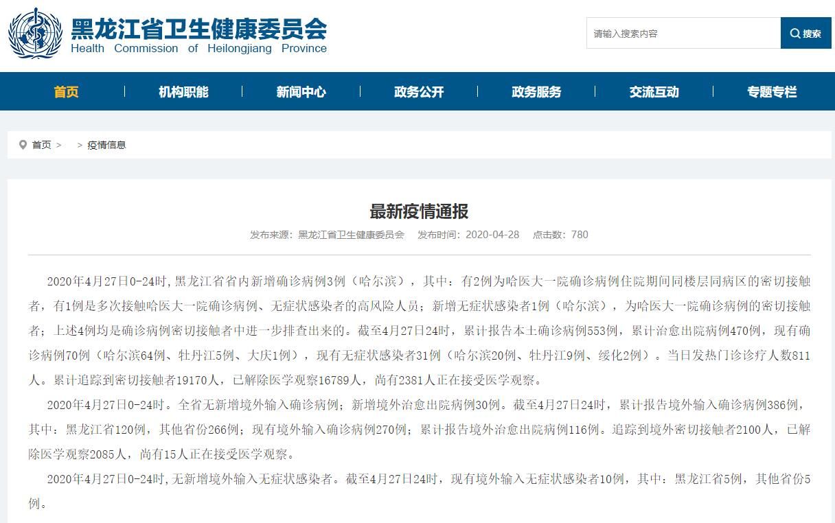 截至4月27日24时,累计报告本土确诊病例553例,累计治愈出院病例470例,现有确诊病例70例(哈尔滨64例、牡丹江5例、大庆1例),现有无症状感染者31例(哈尔滨20例、牡丹江9例、绥化2例)。当日发热门诊诊疗人数811人。累计追踪到密切接触者19170人,已解除医学观察16789人,尚有2381人正在接受医学观察。