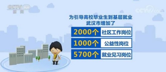 为引导高校毕业生到基层就业,武汉市增加了2000个社区工作岗位、1000个公益性岗位、5700个就业见习岗位;增加了2020年全市公务员、选调生招录计划,将事业单位空缺岗位主要用于专项招聘应届毕业生。