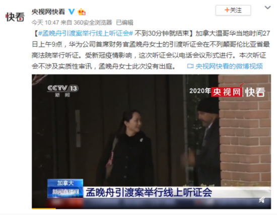 加拿大温哥华当地时间27日上午9点(北京时间28日0点),华为公司首席财务官孟晚舟引渡案在不列颠哥伦比亚省最高法院举行听证。因为新冠肺炎疫情的影响,本次听证采取网上方式进行,开庭后仅仅进行了不到30分钟就结束。