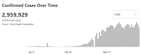 根据世卫组织最新实时统计数据,目前全球确诊新冠肺炎病例达2959929例,死亡202733例,中国以外超过287万例。(总台记者 朱赫)