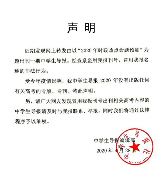 受今年疫情影响,我中学生导报2020年没有出版任何有关高考的专版、专刊。特此声明。