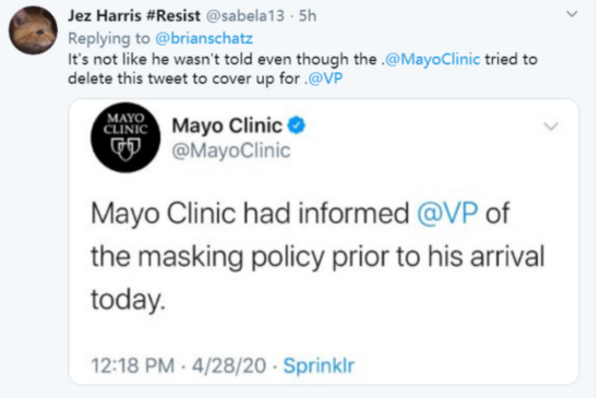 一位美国网友截图称,由于彭斯不戴口罩引起了争议,这家医院甚至把此前声称“已要求彭斯戴口罩”的推文删了。网友认为,这是医院在替彭斯打掩护。