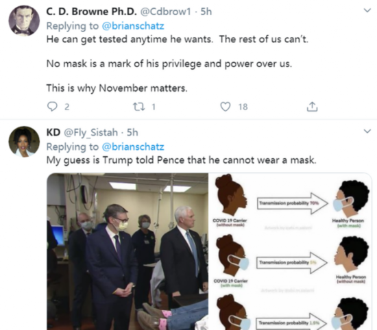 媒体指出,这并非彭斯第一次不戴口罩引起争议了。4月初,在一次会见上,彭斯也被拍到坚持不戴口罩。而他的随从对此的解释,和彭斯这次的反馈如出一辙:彭斯会定期接受检测,因此不必戴口罩。