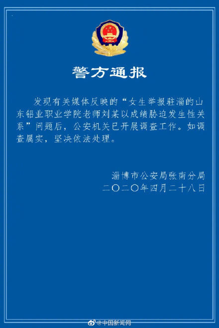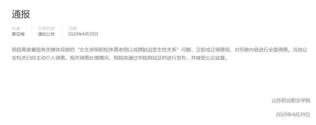 荔枝新闻讯 山东铝业职业学院4约29日就有关媒体反映的“女生举报职校体育老师以成绩胁迫发生性关系”问题发布了相关情况通报,通报称,该院高度重视有关媒体反映的“女生举报职校体育老师以成绩胁迫发生性关系”问题,立即成立调查组,对反映内容进行全面调查。相关调查处理情况,将通过该学院网站及时进行发布,并接受公众监督。
