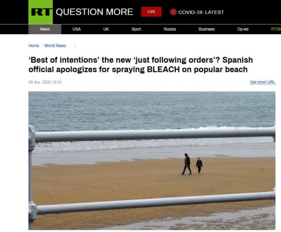 RT说,上周,当看到有车辆在滨海村庄萨阿拉-德洛斯阿图内斯的海滩上喷洒稀释过的消毒剂时,当地居民和环保人士都感到很震惊。RT表示,此举显然是为当地逐步放松防疫限制措施做准备。西班牙政府从4月26日(上周日)起放宽了对14岁以下儿童的隔离措施,规定在满足一定条件下可每日外出一小时。
