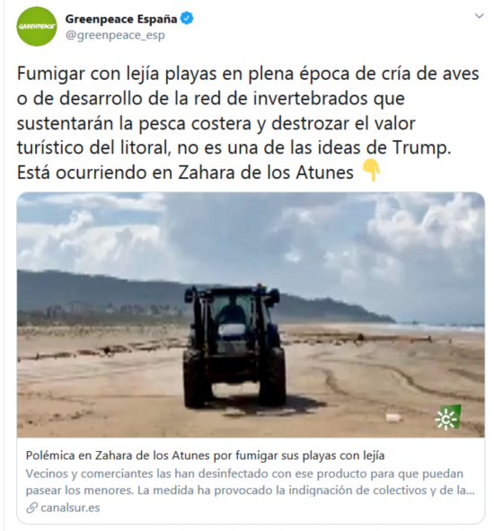 “海滩是一个动态生态系统。当你向它喷洒消毒剂时,就意味着正在杀死所有喷洒范围内的东西,”当地环保主义者贝尼特斯这样抱怨说。此外,RT注意到,非政府环保组织“绿色和平”西班牙分部28日还在推特上吐槽称,这样的做法将摧毁当地海滩的旅游性能,扼杀当地经济发展,听起来就像是“特朗普出的一个主意”。