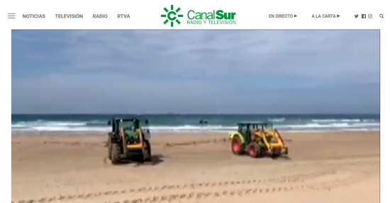 (西班牙萨阿拉小镇一处海滩被喷洒消毒剂。图自西班牙媒体“Canal Sur”)