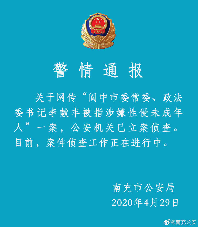 荔枝新闻讯 据@南充公安 消息,关于网传“阆中市常委、政法委书记李献丰被指涉嫌性侵未成年人”一案,公安机关已立案侦查。目前,案件侦查工作正在进行中。