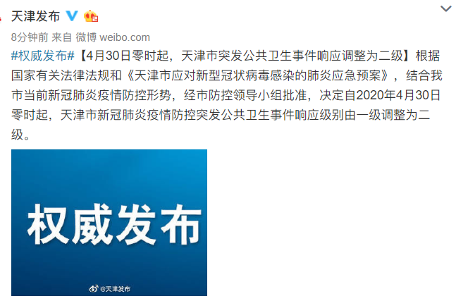 据天津市人民政府新闻办公室官方微博消息:根据国家有关法律法规和《天津市应对新型冠状病毒感染的肺炎应急预案》,结合我市当前新冠肺炎疫情防控形势,经市防控领导小组批准,决定自2020年4月30日零时起,天津市新冠肺炎疫情防控突发公共卫生事件响应级别由一级调整为二级。