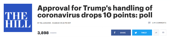 这项民意调查由爱默生学院发起,共1200名美国人参与调查,于4月26日至28日进行,调查误差率为上下浮动2.8个百分点。据《国会山报》报道,爱默生学院当地时间周二(28日)公布的这项民调显示:51%的受访者表示不赞成特朗普应对新冠病毒危机的处理方式,相比3月份的41%上升了10个百分点。