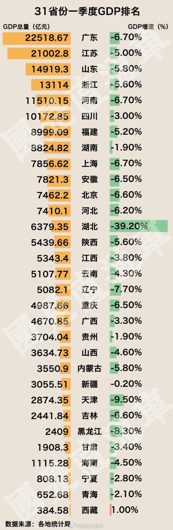 【一季度30省份GDP现负增长】中新社国是直通车记者查阅各地统计局数据发现,一季度共有30个省份GDP负增长,仅西藏保持正值。其中,27地增速“跑赢”全国,疫情“震中”湖北省GDP大幅下降近四成。