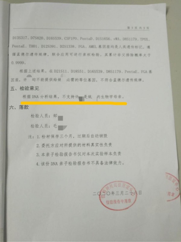 他不曾想到,他的“家庭”会在次日悄然发生变化。3月26日,江西神州司法鉴定中心致电姚俊荣表示,姚斌不是他们的孩子。27日他去南昌取回纸质报告,“根据DNA分析结果,不支持许悦是姚斌的生物学母亲。”