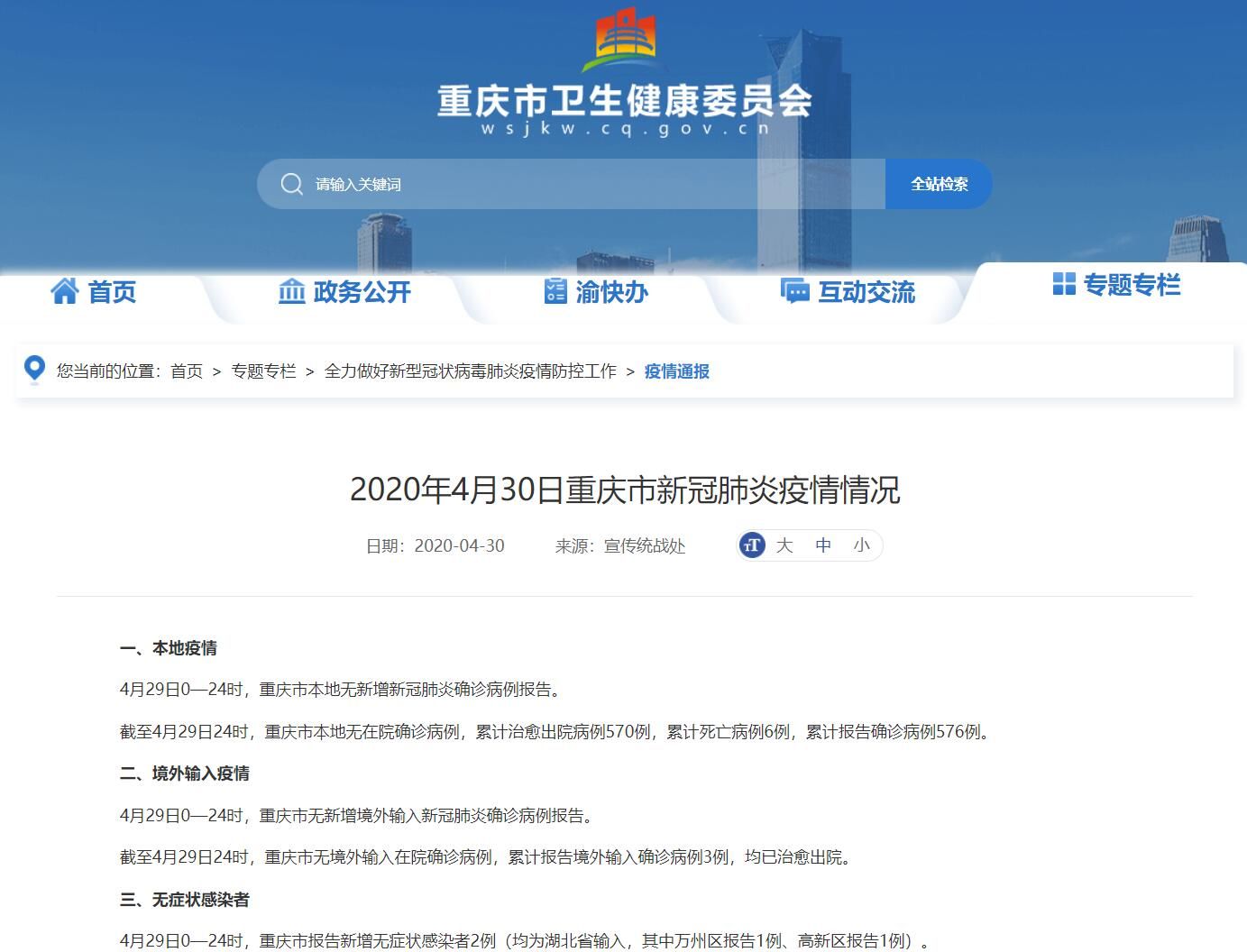 4月29日0—24时,重庆市无新增境外输入新冠肺炎确诊病例报告。