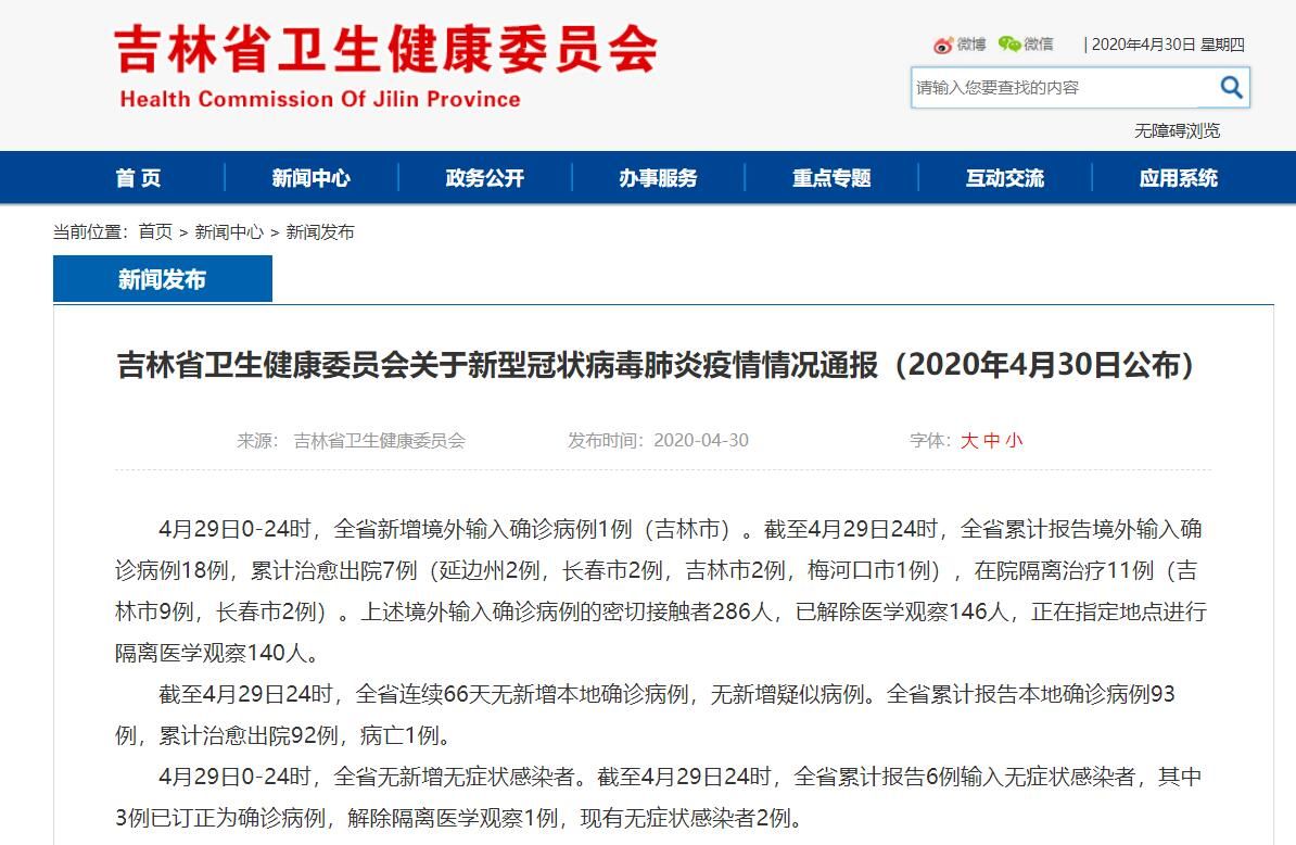 荔枝新闻讯 据吉林卫健委官网消息,4月29日0-24时,吉林省新增境外输入确诊病例1例(吉林市)。截至4月29日24时,全省累计报告境外输入确诊病例18例,累计治愈出院7例(延边州2例,长春市2例,吉林市2例,梅河口市1例),在院隔离治疗11例(吉林市9例,长春市2例)。上述境外输入确诊病例的密切接触者286人,已解除医学观察146人,正在指定地点进行隔离医学观察140人。