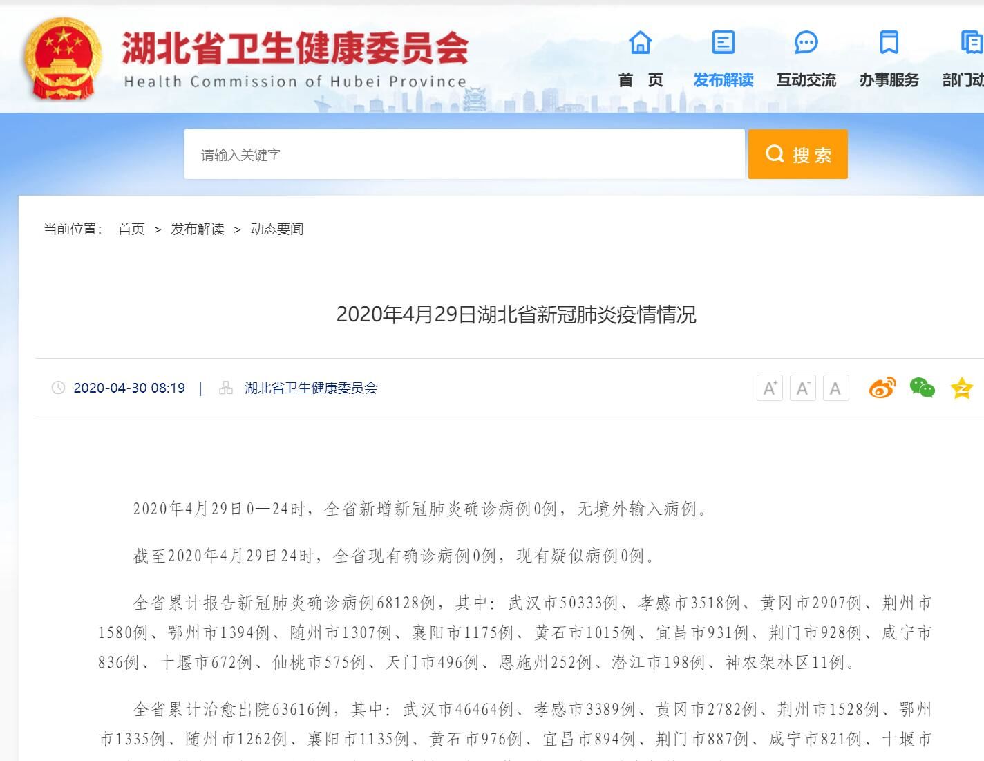 荔枝新闻讯 据湖北卫健委官网消息,2020年4月29日0—24时,湖北省新增新冠肺炎确诊病例0例,无境外输入病例。
