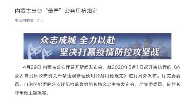 荔枝新闻讯 据内蒙古公安厅官方微信消息,4月29日,内蒙古公安厅召开新闻发布会,就2020年5月1日起开始执行的《内蒙古自治区公安机关严禁违规管理使用公务用枪规定》进行对外发布。厅党委委员、自治区纪委驻公安厅纪检监察组组长杨文忠主持发布会,厅党委委员、副厅长呼禾做主题发布。