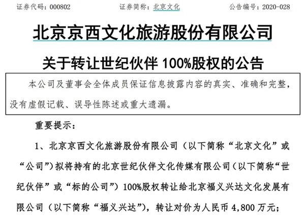 而就在当日早间,北京文化曾公告称,公司拟将持有的世纪伙伴100%股权转让给北京福义兴达文化发展有限公司,转让对价为人民币4800万元,交易标的包括世纪伙伴全部债权和债务。