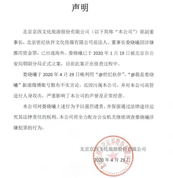 4月29日,北京文化董事长宋歌被北京文化原副董事长、世纪伙伴董事长娄晓曦以“挪用资金、职务侵占、业绩造假”原因实名举报;后公司回应称举报系诋毁污蔑,举报人娄晓曦因涉嫌挪用资金罪,已出逃海外。
