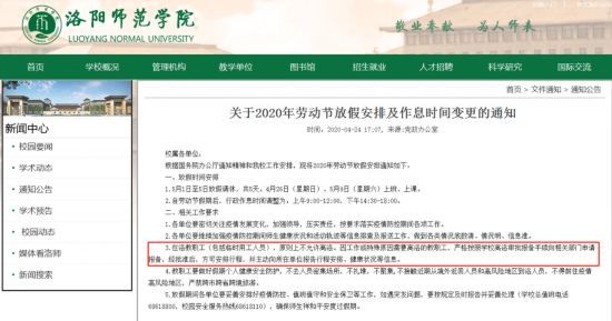 洛阳师范学院在《通知》中指出,在洛教职工(包括临时用工人员),原则上不允许离洛。因工作或特殊原因需要离洛的教职工,严格按照学校离洛审批报备手续向相关部门申请报备,经批准后,方可安排行程,并主动向所在单位报告行程安排、健康状况等信息。