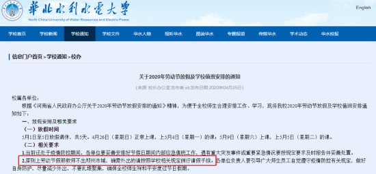 华北水利水电大学在《通知》指出,原则上劳动节假期教师不出郑州市域,确需外出的请按照学校相关规定例行请假手续。各单位负责人要引导广大师生员工自觉遵守疫情防控有关规定,做好自身防护,尽量减少外出,不要扎堆聚集,确保全校师生祥和平安度过节日假期。