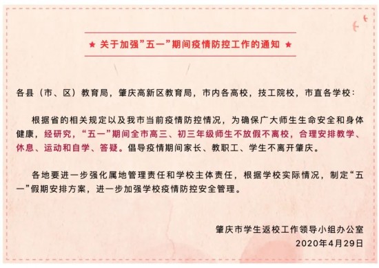 昨天,“肇庆发布”公众号发布消息称,根据省的相关规定以及我市当前疫情防控情况,为确保广大师生生命安全和身体健康,经研究,“五一”期间全市高三、初三年级师生不放假不离校,合理安排教学、休息、运动和自学、答疑。倡导疫情期间家长、教职工、学生不离开肇庆。