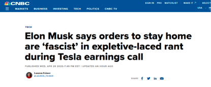 “靠!(what the f……!)这是暴行,是暴行!”29日,特斯拉创始人马斯克罕见“失态”。而他飙脏话的对象却是当下地球上很多人都经历过或正在经历的“保命措施”——居家隔离。他的逻辑是,居家令严重伤害经济活动,“特斯拉可以扛过这场风暴但很多小企业不行”。他甚至指责政府实施居家限制是搞“法西斯主义”,伤害了宪法赋予美国人的自由。但在社交媒体上,有人自由地反驳马斯克的言论,认为只顾富人利益不顾工人死活才是“法西斯主义”。