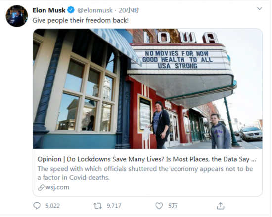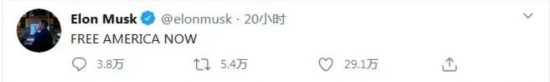 值得注意的是,除了在电话会议上表达对“居家令”的强烈不满,马斯克29日也在推特上强化了自己的这一观点。他先后发布两条推文,第一则写道,“把人们的自由还给他们!”↓