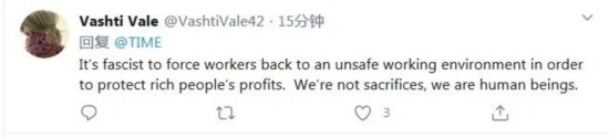 “为了维护有钱人的利益而强迫工人回到不安全的工作环境中去,这才是法西斯主义。我们不是牺牲品,我们是(活生生的)人。”