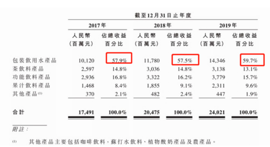 从细分品类来看,2017年、2018年以及2019年的营收中,农夫山泉饮用水收入占比都超过57%,近一年稍有提升至59.7%达143.5亿元,而茶饮料和功能饮料的占比则分别为13.1%和15.7%。