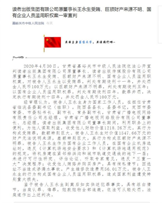 据嘉峪关市中级人民法院微信公众号消息,30日,甘肃省嘉峪关市中级人民法院依法公开宣判读者出版集团有限公司原董事长、读者出版传媒股份有限公司原董事长王永生受贿、巨额财产来源不明、国有企业人员滥用职权案。