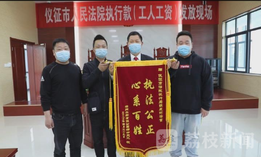 领到拖欠已久的工资,江苏兴邦资源利用有限公司员工代表们将书写“执法公正、心系百姓”旌旗送给仪征市人民法院。