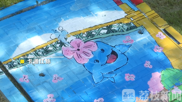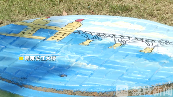 南京开林园林绿化工程有限公司养护部万程鹏介绍:“从这里可以看到长江大桥剪影,所以在窨井盖上画了两个碉堡;前面不远处就是南京江豚观测点,所以画了只江豚。”
