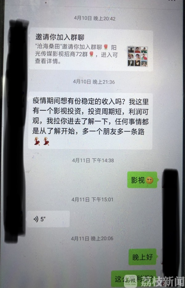 王女士平时喜欢投资理财,为此还加入了许多投资理财的微信群。今年3月份,男子沧某(化名)通过某投资理财微信群添加王女士的微信,并向其推荐了一款投资影视作品的理财项目。为让王女士放心,沧某还将王女士拉进一个名叫“阳光影视传媒”的微信群。王女士一开始也很谨慎,只是抱着了解了解的心态加入了“阳光影视传媒”微信群。每天,微信群里都会有人讲课,不断地向王女士灌输这个项目的好处:周期短、收益高、安全性强,之前投资的人都已经赚到了钱。同时,沧某还私下给王女士“洗脑”,声称他亲自去影视传媒公司考察过,绝对没问题,并将之前投资人的合同发给她看。