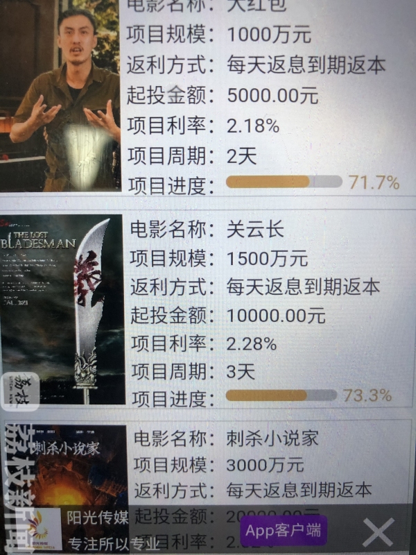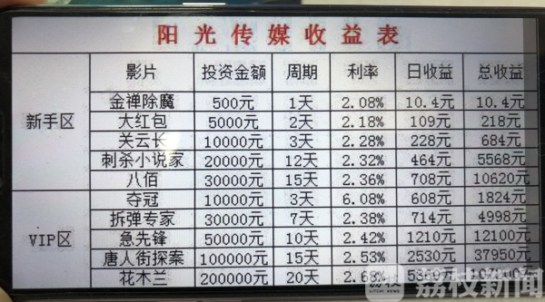 该影视投资项目下面分为多个子项目,都在一张名为“阳光传媒收益表”的表格里详细列明。表格分为新手区和VIP区,标注了影片名称、投资金额、周期、利率、日收益和总收益。4月13日,王女士准备试试水,在“阳光传媒”APP充值500元购买了《金蝉除魔》项目。但沧某告诉她,投资人必须先在新手区投资2万才能到VIP区继续投资。为了进入VIP区赚更多钱,王女士于当日又充值2万元投资《刺杀小说家》项目。
