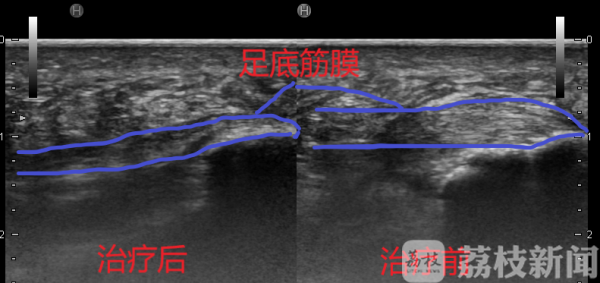 “这是足底筋膜炎导致的足跟痛,其中跖腱膜水肿已经非常明显,需要及时开展治疗。”吴野环医生表示,“足跟痛一般是由长期、慢性的损伤引起,王女士的病情很可能和暴走有关。如果不及时治疗,严重时可致足跟肿胀、发红,痛到甚至不能行走,常见足跟痛由足跟骨刺、跖腱膜炎、足跟脂肪垫炎、跟骨后滑囊炎、跟腱炎等原因引起。”吴野环医生为王女士制定了个体化的治疗方案,经过2周的治疗,王女士的足跟疼痛明显改善,决定在即将到来的“五一小长假”出门走走。