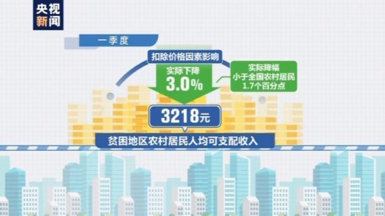 一季度,贫困地区农村居民人均可支配收入3218元,比上年同期名义增长2.7%,扣除价格因素影响,实际下降3.0%,实际降幅小于全国农村居民1.7个百分点。