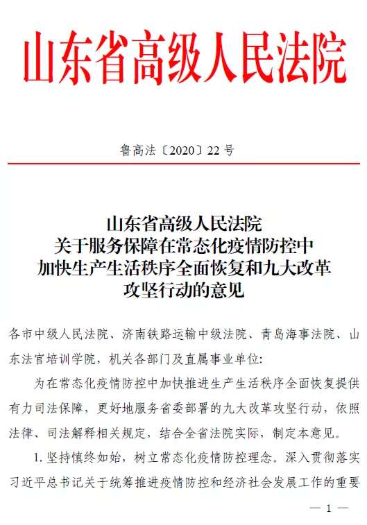 近日山东省高级人民法院发布了《关于服务保障在常态化疫情防控中加快生产生活秩序全面恢复和九大改革攻坚行动的意见》,全力支持企业复工复产。